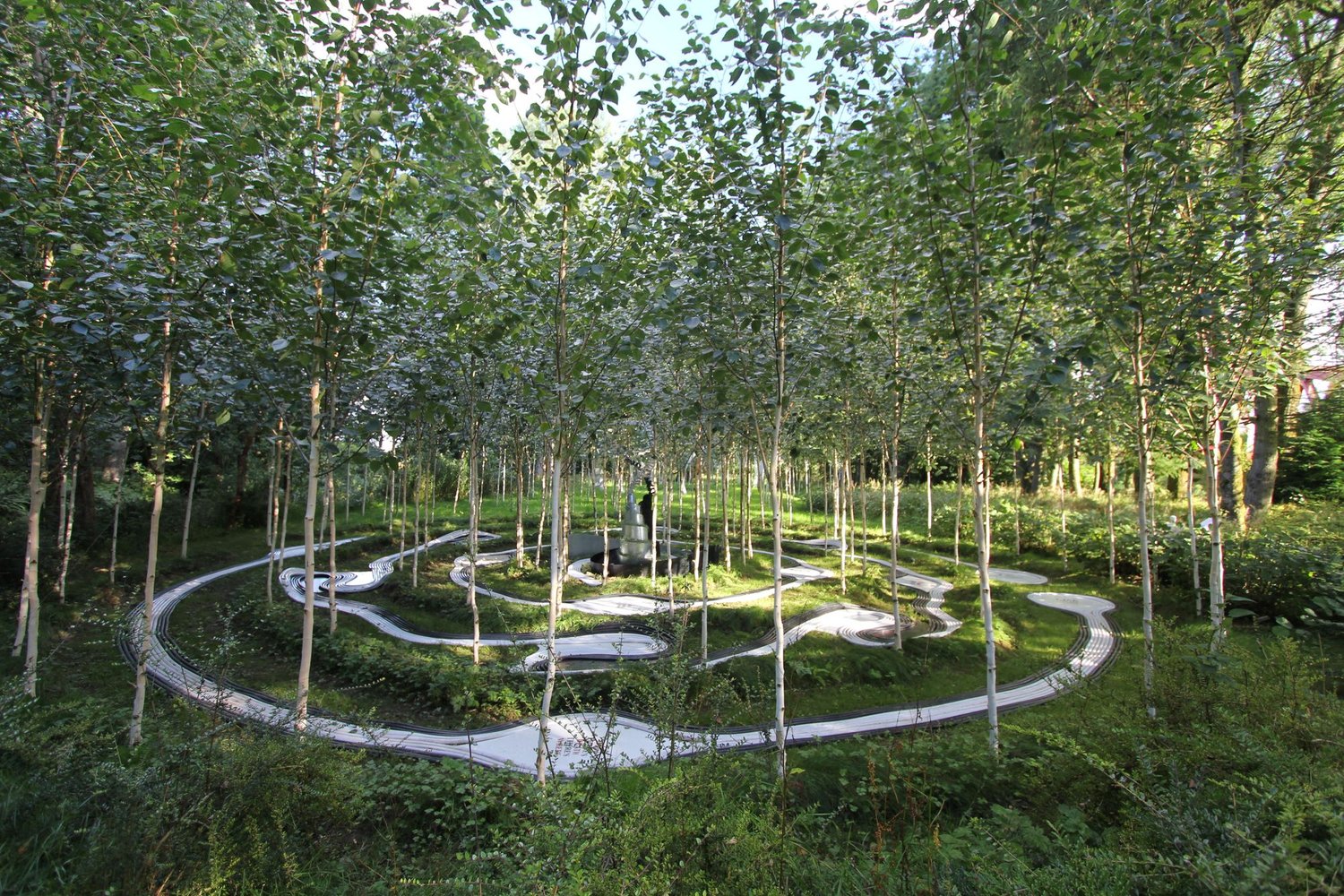 The Garden of Cosmic Speculation is a garden designed by Charles Jencks in Dumfriesshire, Scotland. It features 40 major areas: gardens, bridges, landforms, sculptures, terraces, fences and architectural works. Covering 30 acres, the garden uses nature to celebrate nature, both intellectually and through the senses, including the sense of humor. A water cascade of steps recounts the story of the universe, a terrace shows the distortion of space and time caused by a black hole, a "Quark Walk" takes the visitor on a journey to the smallest building blocks of matter, and a series of landforms and lakes recall fractal geometry.