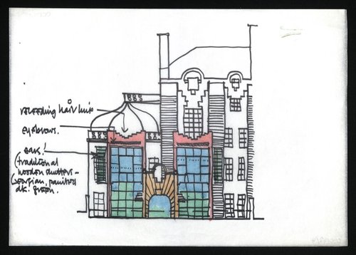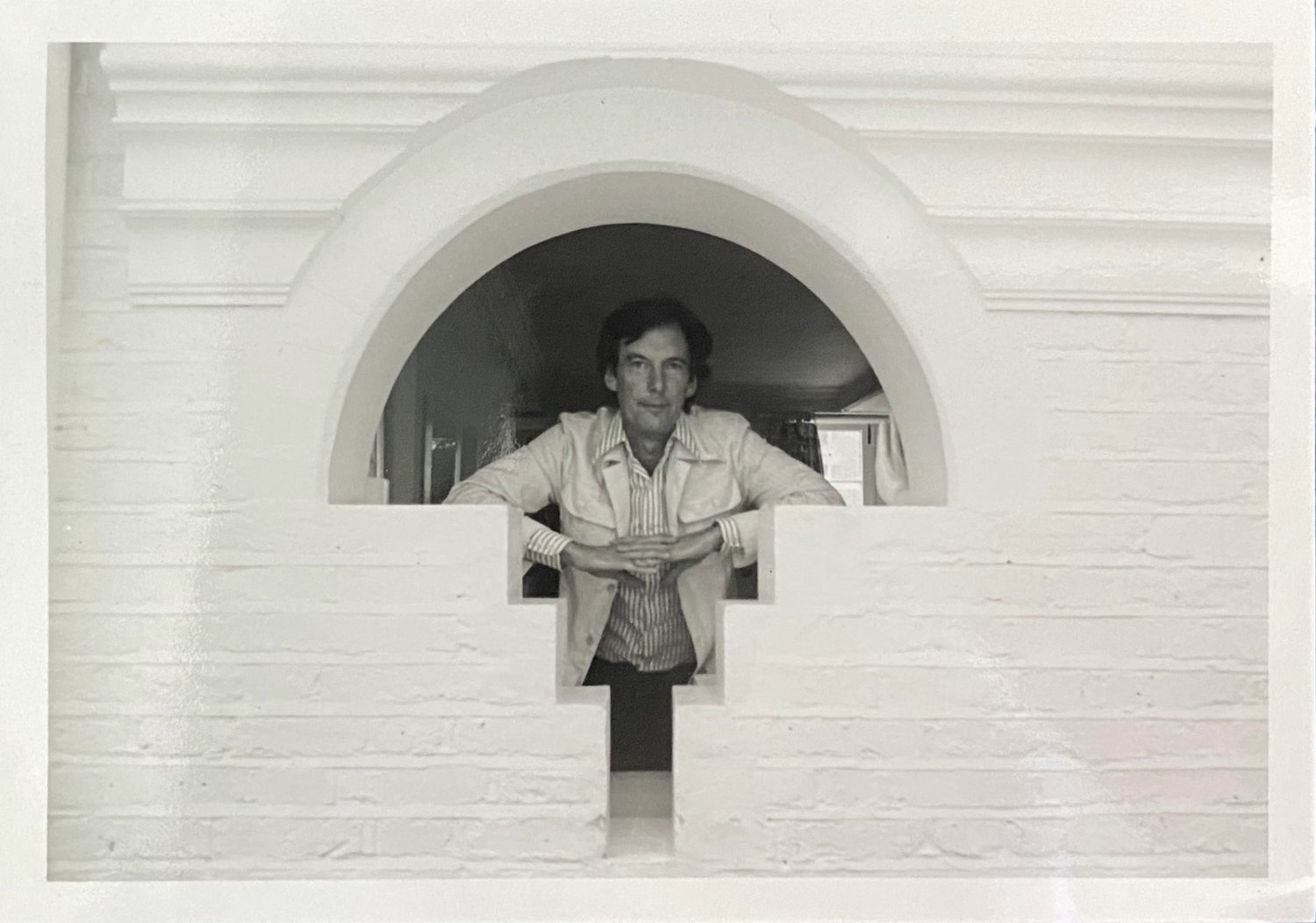 Jencks’ interest in symbols, signs and semiotics led him to design the Jencksiana, a flexible motif resembling an abstracted human face that is repeated in different variations throughout The Cosmic House. The curved elements and a stagger combine to create a suggestion of a forehead, eyes and a chin. This personal motif – modelled on the Palladian Serliana window – returns in various versions and scales throughout the interiors and exteriors of the house, framing windows, doors, furniture, or the corners of rooms below the ceilings. As its name suggests, it was designed both as Jencks’ personal trademark and as an anthropomorphic symbol, giving the building a face to look back at its inhabitant.